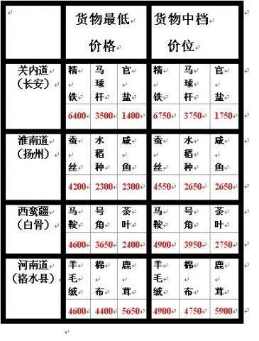然后到扬州全部卖出进货,扬州蚕丝是最赚的。价格浮动在4200-4600之间都行。蚕丝卖到长安和剑南道都是赚。但剑南道是最赚钱的。这看你自己的选择。水稻只有卖到剑南道是赚钱的,价格浮动2400-2700都行。不过对于跑短线来说,去剑南道太远了,并不划算,所以短线不推荐去剑南道。