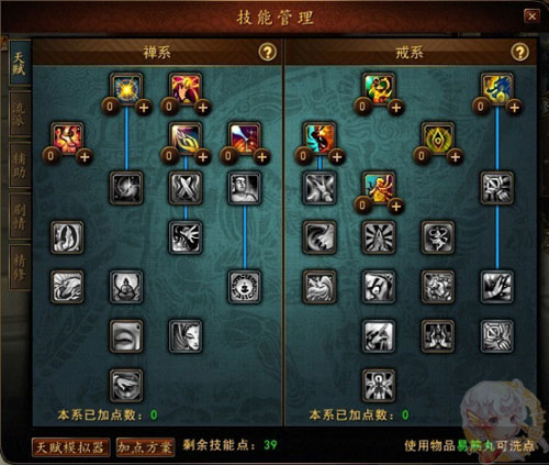进入游戏后,我们可以按Z键打开技能栏,如图。可以看到技能分为两系,可以根据自己的需要选择1系别进行加点,在不熟悉游戏环境下千万别左顾右盼,盯准一系加则可,日后通过了解和体验方可双修换系等尝试: