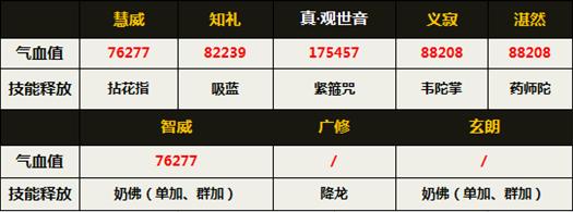 l 要点说明 进场后就会存在2个状态:威压、神威 A:威压:每回合生命降低最大生命的10%(进场后存在的状态,本次战斗持续有效) B:神威·强:屏蔽一些治疗和恢复效果(进场后存在的状态持续四回合,四回合后转 换为神威·弱) C:神威·弱:治疗和恢复效果降低至50%(持续两回合) D:神威·破:可以正常治疗(持续1回合) E:紧箍咒:生命减少,且无法进行任何行动(持续三回合,作用2个单位。减少的生 命在880左右) l 通关攻略:点杀观音。剩下的怪物根据队伍情况选择先后顺序点杀。 l 注意事项: A:复活用九转太乙还丹 B:韦陀掌是100%晕人 v 最佳明星:观世音