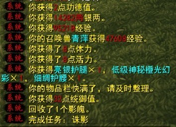 影子死人没有损失,不按正常死亡算!掉落:体活,高额经验,部分金钱,功德值,符合你的等级阶段的蓝绿橙色装备(即使怪是90的,你是89J的人物,那么掉的装备也是80的),低级女娲石,低级幻彩,召唤兽内丹。流程