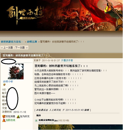 近日,在网易《创世西游》官方论坛上,再次惊现了一位无孔不入的“舅舅党”成员:一名资深玩家于5月16日凌晨01:37发帖,大曝结婚系统的开发内幕,并上传了数张号称是“《创世西游》结婚系统”的游戏截图。在帖子中,该玩家只表示关于结婚系统的最新消息来源于游戏开发组成员,但没有明确表示图片的来源。但从截图的美术风格来看,与《创世西游》的美术风格极为接近,故可信度非常高。