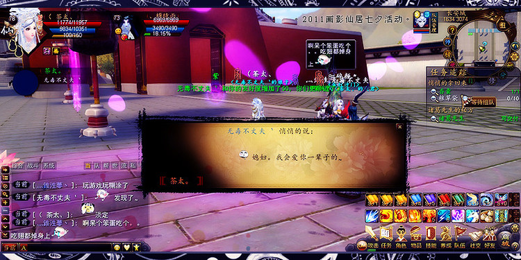 8月5日。我一蛋疼就买了商城时装……然后屁颠屁颠的穿给你看,顺便抱怨着礼包送的鸳鸯笺用不掉的时候,你突然说,“媳妇,今天晚上我们游街吧。”