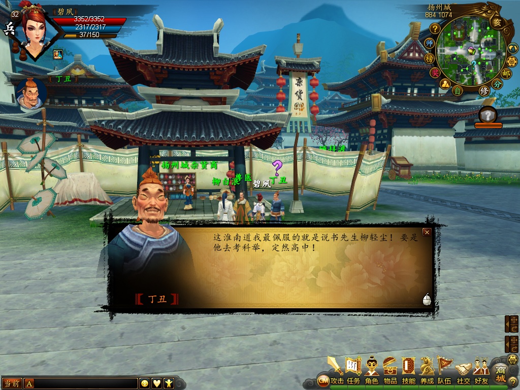 32级科举引导任务: 蟾宫夜话 领取地点:淮南道扬州城(885 1075) 任务领取人:丁丑 领取要求:≥32级 剧情简介:你在扬州城遇到丁丑知道科举之后,机缘巧合遇到范进之、沈碧水、宋如玉,桩桩皆是可恨之事,历经一切你倍感颓丧,陇右的元极公子亦是如此,甚至他选择了避世不出。直到魏征点醒了你们,希冀赤明中人能尽一己绵薄之力开创盛世。 任务涉及的人物:丁丑、柳轻尘、青珠、范进之、碧如、沈碧水、元极、梅狄、宋如玉、魏征、蒋启俊、宫璞、王玄策、宇文士及。 剧情任务的奖励以经验为主,获得当前等级段升级所需大部分经验奖励及相应召唤兽经验奖励。