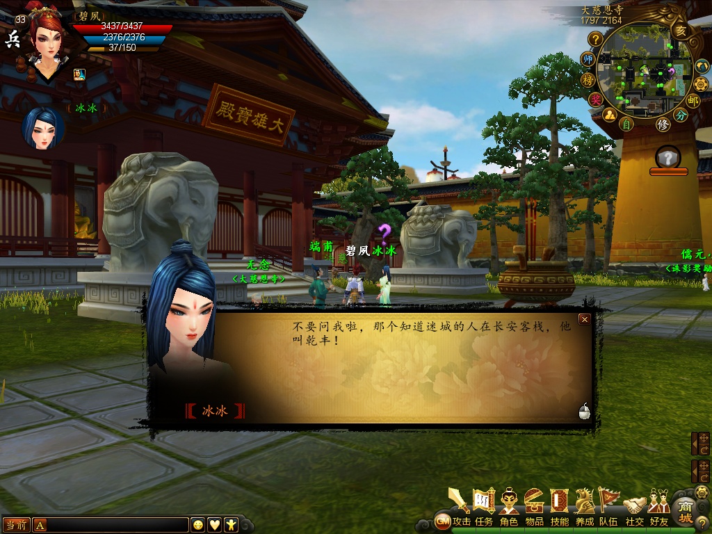 33级生死劫引导任务: 梦失迷城镜 领取地点:关内道长安城(1795 2166) 任务领取人:冰冰 领取要求:≥33级 剧情简介:故事要从你在长安城的见闻说起,意外之下你知道了迷城的存在,还得到了神秘云游僧的指点,找到了可能智首大师。在智首大师的帮助下,你进入了传说中的迷城――因执念心魔而存在的幽暗迷城。 任务涉及的人物:冰冰、乾丰、云游僧、流云、暗夜、秋断水、绿锋、逸竹、战神、江流儿、智首大师。 剧情任务的奖励以经验为主,获得当前等级段升级所需大部分经验奖励及相应召唤兽经验奖励。